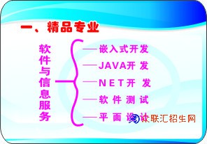 一、“软件与信息服务专业”设有:嵌入式开发、JAVA开发、NET开发、软件测试、平面设计等五个方向。此专业全省领先,是国内十大热门专业之一。从事各种网站、电子政务、电子商务、管理系统、手机APP、桌面程序、智能化电子设备、机器、设计监控与控制等智能程序,及UI设计和平面广告设计、包装设计、淘宝店美工等工作。